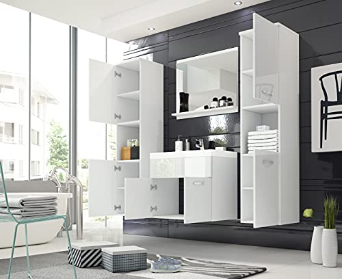 De set bevat twee hoge kasten, een spiegel met een klein rek, een wastafelkast en een wastafel.