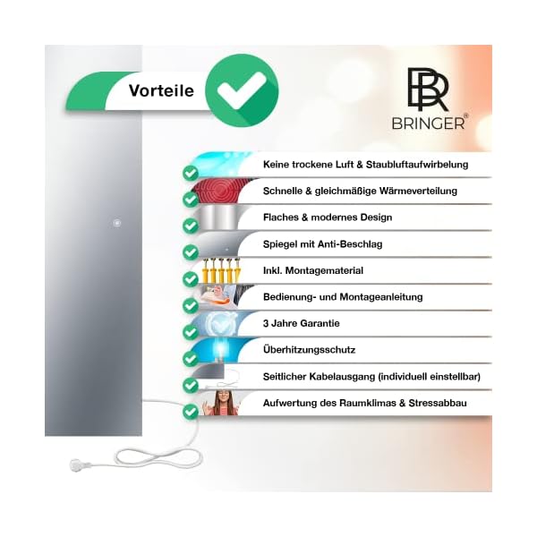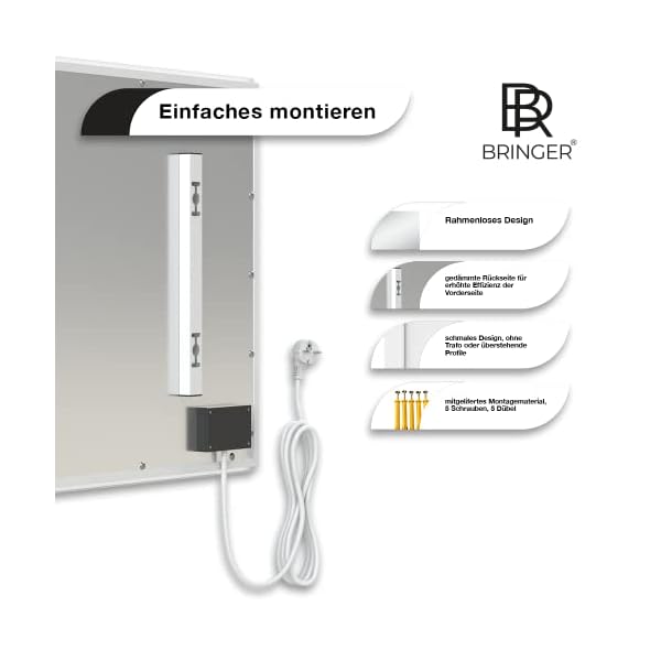 Inhoud levering: 1 x Bringer infraroodverwarming spiegel. Afmetingen: 60 x 80 cm, 5 x pluggen en schroeven, 1 x voeding, 1 x handleiding en montagehandleiding (mogelijk niet beschikbaar in het Nederlands)